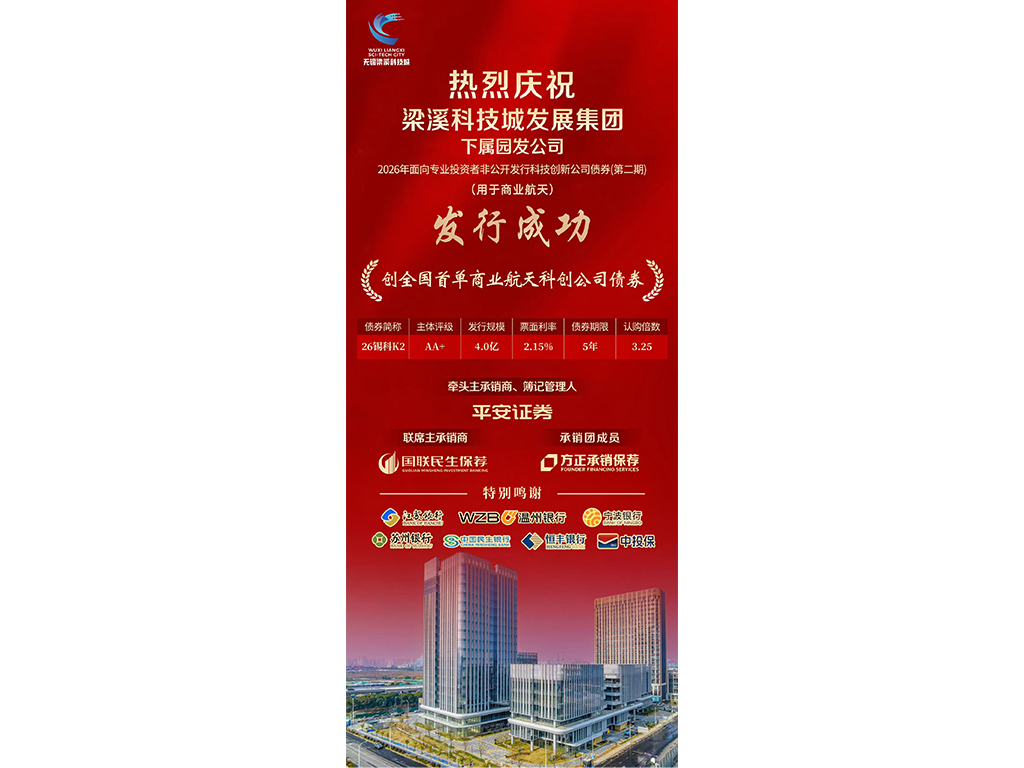 2026年4月8日,由中国投融资担保股份有限公司(简称“中投保”)提供增信支持的全国首单商业航天科技创新公司债券——“无锡市梁溪科技城园区发展集团有限公司2026年面向专业投资者非公开发行科技创新公司债券(第二期)(用于商业航天)”在深圳证券交易所成功发行,债券发行规模4亿元,期限5年期。